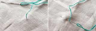 1.มัดปมปลายไหมปักให้เรียบร้อย ก่อนจะแทงเข็มจากตะเข็บผ้าด้านในขึ้นมาค่ะ ปมจะได้ถูกซ่อนไว้ในผ้า แทงให้ห่างจากขอบผ้าเล็กน้อยนะคะ