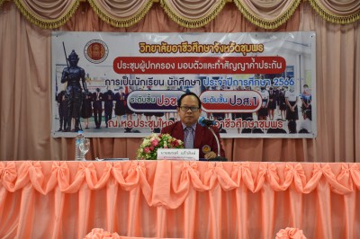 ดร.ณรงค์ แก้วสิงห์ ผู้อำนวยการวิทยาลัยอาชีวศึกษาชุมพร เป็นประธานในการประชุมผู้ปกครอง มอบตัว ทำสัญญาค้ำประกัน และชำระเงินค่าใช้จ่าย ของนักเรียน ระดับชั้น ปวส.1 ประจำปีการศึกษา 2566