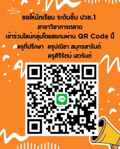 ขอให้นักเรียน ระดับชั้น ปวช.1 ปีการศึกษา 2566 สาขาวิชาการตลาด เข้าร่วมไลน์กลุ่มห้องเรียน โดยสแกน QR Code ด้านล่างนี้