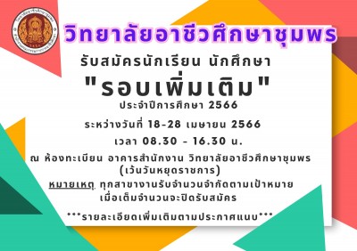รับสมัครนักเรียน นักศึกษา ระดับชั้น ปวช.1 และ ปวส.1 ประจำปีการศึกษา 2566 (รอบเพิ่มเติม) รับสมัครตั้งแต่วันที่ 18 - 28 เมษายน 2566 ณ ห้องทะเบียน อาคารสำนักงาน วิทยาลัยอาชีวศึกษาชุมพร