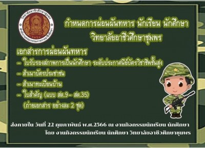 กำหนดการผ่อนผันทหาร นักเรียน นักศึกษา วิทยาลัยอาชีวศึกษาชุมพร 📍เตรียมเอกสารดังประกาศแนบและนำส่งเอกสารภายในวันที่ 22 กุมภาพันธ์ พ.ศ.2566 ณ ห้องงานกิจกรรมนักเรียน นักศึกษา วิทยาลัยอาชีวศึกษาชุมพร