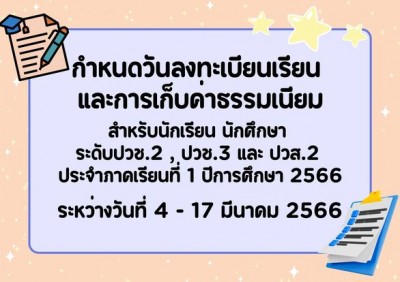 กำหนดวันลงทะเบียนเรียน และการเก็บค่าธรรมเนียม ค่าใช้จ่ายสำหรับนักเรียน นักศึกษา ระดับปวช.2 , ปวช.3 และ ปวส.2 ประจำภาคเรียนที่ 1 ปีการศึกษา 2566 ในระหว่างวันที่ 4 - 17 มีนาคม 2566