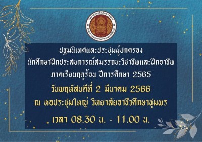 กำหนดการปฐมนิเทศและประชุมผู้ปกครองนักศึกษาฝึกประสบการณ์สมรรถนะวิชาชีพและฝึกอาชีพ ภาคเรียนฤดูร้อน ปีการศึกษา 2565