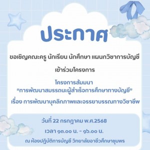 📢ขอเชิญคณะครูนักเรียนนักศึกษาแผนกวิชาการบัญชีเข้าร่วม โครงการสัมมนา การพัฒนา สมรรถนะ ผู้สำเร็จการศึกษาทางการบัญชี เรื่อง การพัฒนาบุคลิกภาพและจรรยาบรรณทางวิชาชีพ ในวันอังคารที่ 22 กรกฎาคม 2568 เวลา 13.00 -16.00 น. ณ ห้องปฏิบัติการบัญชี วิทยาลัยอาชีวศึกษาชุมพร