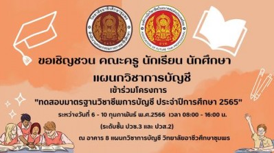 ขอเชิญชวนคณะครู นักเรียน นักศึกษา แผนกวิชาการบัญชี เข้าร่วมโครงการ ทดสอบมาตรฐานวิชาชีพการบัญชี ประจำปีการศึกษา 2565