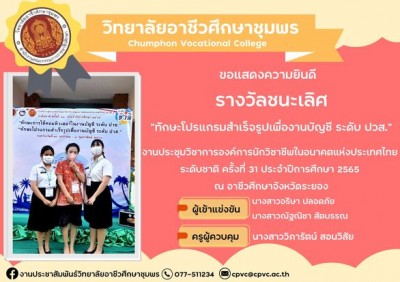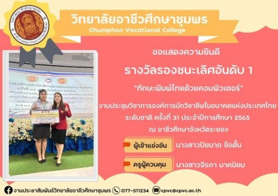 วิทยาลัยอาชีวศึกษาชุมพร ขอแสดงความยินดีกับนักเรียน และครูผู้ควบคุมทีม รางวัลรองชนะเลิศอันดับ 1 การแข่งขันทักษะพิมพ์ไทยด้วยคอมพิวเตอร์