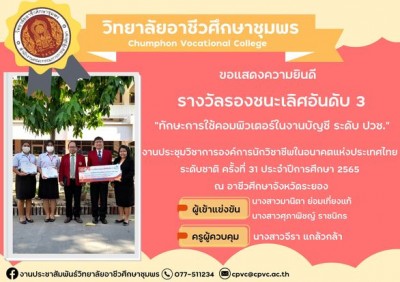 วิทยาลัยอาชีวศึกษาชุมพร ขอแสดงความยินดีกับนักเรียน และครูผู้ควบคุมทีม รางวัลรองชนะเลิศอันดับ 3 การแข่งขันทักษะการใช้คอมพิวเตอร์ในงานบัญชี ระดับปวช.