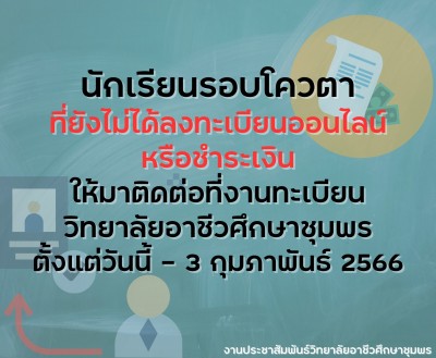 นักเรียนรอบโควตา ที่ยังไม่ได้ลงทะเบียนออนไลน์หรือชำระเงิน❗️ ให้มาติดต่อที่งานทะเบียน วิทยาลัยอาชีวศึกษาชุมพร