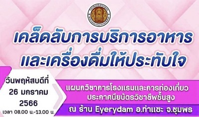 ขอเชิญชวนคณะครู นักเรียน นักศึกษา แผนกวิชาการโรงแรมและการท่องเที่ยว เข้าร่วมโครงการ เคล็ดลับการบริการอาหารและเครื่องดื่มให้ประทับใจ