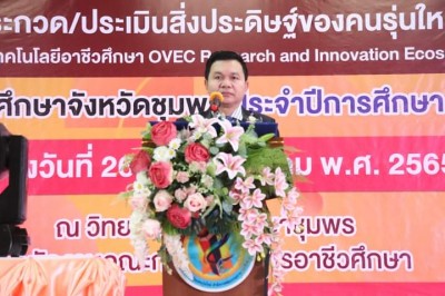 รองผู้อำนวยการวิทยาลัยอาชีวศึกษาชุมพร ฝ่ายวิชาการและแผนงานและความร่วมมือ ให้เกียรติเป็นประธานมอบเกียรติบัตร และถ้วยรางวัล แก่นักเรียนนักศึกษาที่เข้าร่วมการประกวด/ประเมินสิ่งประดิษฐ์ของคนรุ่นใหม่ ระดับจังหวัด ประจำปีการศึกษา 2565