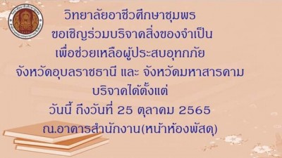 ประธานกรรมการอาชีวศึกษาจังหวัดชุมพรพร้อมด้วยคณะผู้บริหารสถานศึกษาในสังกัดอาชีวศึกษาจังหวัดชุมพรร่วมส่งมอบสิ่งของบรรเทาทุกข์แก่ผู้ประสบอุทกภัยในจังหวัดอุบลราชธานีและจังหวัดมหาสารคาม