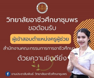 วิทยาลัยอาชีวศึกษาชุมพร ขอต้อนรับ ผู้เข้าสอบคัดเลือกเพื่อบรรจุและแต่งตั้งบุคคลเข้ารับราชการเป็นข้าราชการครูและบุคลากรทางการศึกษาตำแหน่งครูผู้ช่วย
