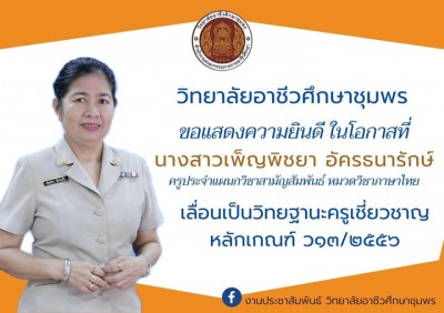 ขอแสดงความยินดี ในโอกาสที่ นางสาวเพ็ญพิชยา อัครธนารักษ์ ครูประจำแผนกวิชาสามัญสัมพันธ์ หมวดวิชาภาษาไทย วิทยาลัยอาชีวศึกษาชุมพร เลื่อนเป็นวิทยฐานะครูเชี่ยวชาญ