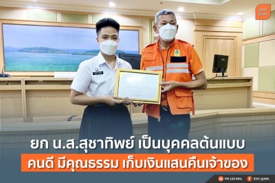 จังหวัดชุมพรมอบเกียรติบัตรชื่นชม น.ส.สุชาทิพย์ เก็บเงินแสนคืนเจ้าของ ยกเป็นบุคคลต้นแบบ คนดี มีคุณธรรม