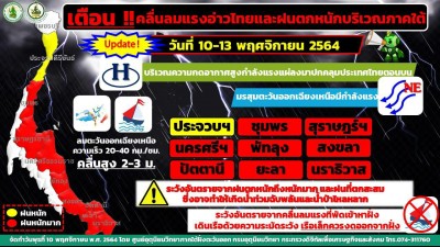 เรื่อง คลื่นลมแรงบริเวณอ่าวไทยและมีฝนตกหนักบริเวณภาคใต้ฝั่งตะวันออก (มีผลกระทบช่วงวันที่ ๑๑-๑๓ พฤศจิกายน ๒๕๖๔)