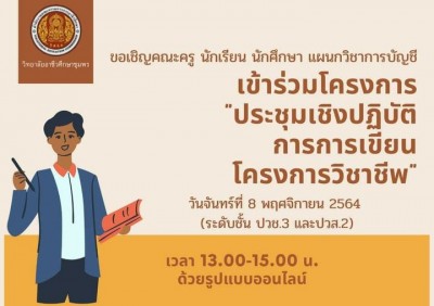 ขอเชิญคณะครู นักเรียน นักศึกษา แผนกวิชาการบัญชีเข้าร่วมโครงการ ประชุมเชิงปฏิบัติการการเขียนโครงการวิชาชีพ ปีการศึกษา 2564
