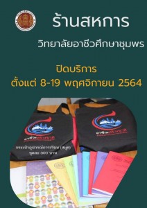 ร้านสหการ วิทยาลัยอาชีวศึกษาชุมพร ปิดบริการ ตั้งแต่วันที่ 8-19 พฤศจิกายน 2564