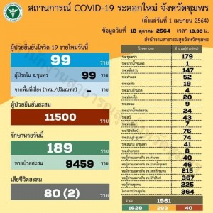 รายงานสถานการณ์ผู้ติดเชื้อไวรัสโคโรนา (โควิด -19) วันจันทร์ที่ 18 ตุลาคม 2564