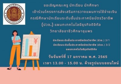 ขอเชิญคณะครูและนักเรียนระดับชั้นปวช.3/1 และ 3/2 สาขางานคอมพิวเตอร์ธุรกิจ เข้าร่วมโครงการส่งเสริมการวางแผนการใช้จ่ายเงิน