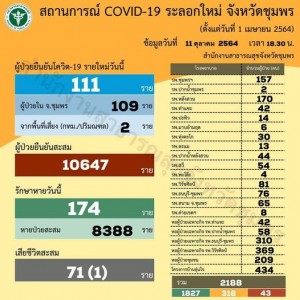 รายงานสถานการณ์ผู้ติดเชื้อไวรัสโคโรนา (โควิด -19) จันทร์ที่ 11 ตุลาคม 2564