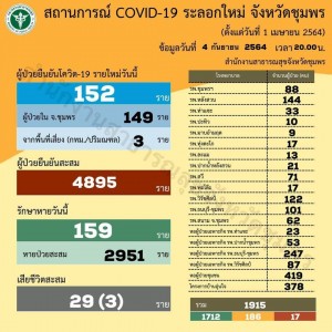 ยอดรายใหม่152คน วันเสาร์ที่ 4 กันยายน 2564 รายงานสถานการณ์ผู้ติดเชื้อไวรัสโคโรนา (โควิด-19) จังหวัดชุมพร วันนี้มีผู้ป่วยยืนยันรายใหม่ 152 คน ยอดยืนยันสะสมรวม 4,895 คน