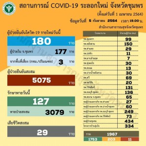 ยอดรายใหม่180คน วันอาทิตย์ที่ 5 กันยายน 2564 รายงานสถานการณ์ผู้ติดเชื้อไวรัสโคโรนา (โควิด-19) จังหวัดชุมพร วันนี้มีผู้ป่วยยืนยันรายใหม่ 180 คน ยอดยืนยันสะสมรวม 5,075 คน