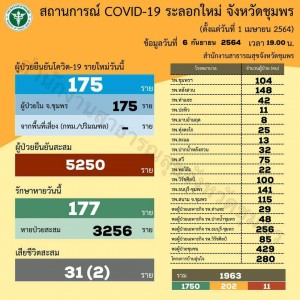 ยอดรายใหม่175คน วันจันทร์ที่ 6 กันยายน 2564 รายงานสถานการณ์ผู้ติดเชื้อไวรัสโคโรนา (โควิด-19) จังหวัดชุมพร วันนี้มีผู้ป่วยยืนยันรายใหม่ 175 คน ยอดยืนยันสะสมรวม 5,250 คน