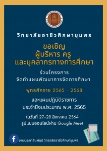 วันนี้ (27 ส.ค.2564) เวลา 13.00 น. นายอำนวย นวลจันทร์ ผู้อำนวยการวิทยาลัยอาชีวศึกษาชุมพร เป็นประธานพิธีเปิดโครงการจัดทำแผนพัฒนาการจัดการศึกษา