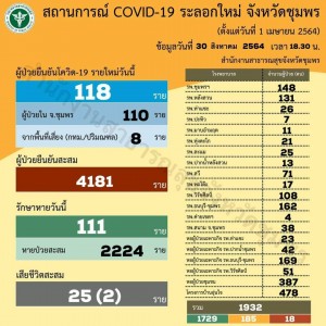#ยอดรายใหม่118คน วันจันทร์ที่ 30 สิงหาคม 2564 รายงานสถานการณ์ผู้ติดเชื้อไวรัสโคโรนา (โควิด-19) จังหวัดชุมพร วันนี้มีผู้ป่วยยืนยันรายใหม่ 118 คน ยอดยืนยันสะสมรวม 4,181 คน
