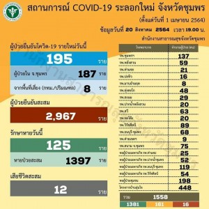 #ยอดพุ่งสูง วันศุกร์ที่ 20 สิงหาคม 2564 รายงานสถานการณ์ผู้ติดเชื้อไวรัสโคโรนา (โควิด-19) จังหวัดชุมพร วันนี้มีผู้ป่วยยืนยันรายใหม่ 195 คน ยอดยืนยันสะสมรวม 2,967 คน
