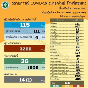ยอดรายใหม่ยังคงอยู่ที่หลักร้อย วันอาทิตย์ที่ 22 สิงหาคม 2564 รายงานสถานการณ์ผู้ติดเชื้อไวรัสโคโรนา (โควิด-19) จังหวัดชุมพร วันนี้มีผู้ป่วยยืนยันรายใหม่ 115 คน ยอดยืนยันสะสมรวม 3,266 คน
