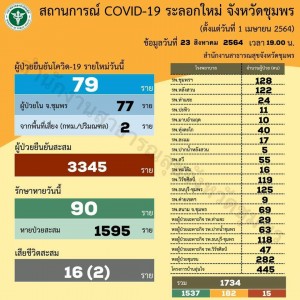 #ตัวเลขลดลงทำให้เรายิ้มได้ วันจันทร์ที่ 23 สิงหาคม 2564 รายงานสถานการณ์ผู้ติดเชื้อไวรัสโคโรนา (โควิด-19) จังหวัดชุมพร วันนี้มีผู้ป่วยยืนยันรายใหม่ 79 คน ยอดยืนยันสะสมรวม 3,345 คน