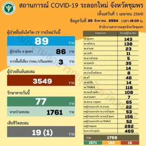 ขอให้ตัวเลขลดลงเช่นนี้ วันพุธที่ 25 สิงหาคม 2564 รายงานสถานการณ์ผู้ติดเชื้อไวรัสโคโรนา (โควิด-19) จังหวัดชุมพร วันนี้มีผู้ป่วยยืนยันรายใหม่ 89 คน ยอดยืนยันสะสมรวม 3,549 คน