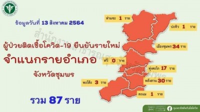 วันศุกร์ที่ 13 สิงหาคม 2564 รายงานสถานการณ์ผู้ติดเชื้อไวรัสโคโรนา (โควิด-19) จังหวัดชุมพร วันนี้มีผู้ป่วยยืนยันรายใหม่ 87 คน ยอดยืนยันสะสมรวม 2,041 คน