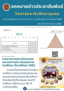 งานประกันคุณภาพและมาตรฐานการศึกษา รายงานการประเมินตนเอง และผลการประเมินคุณภาพการศึกษา วิทยาลัยอาชีวศึกษาชุมพร ประจำปีการศึกษา 2563 คะแนน 98.76 #ระดับยอดเยี่ยม