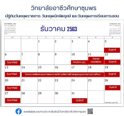 วันหยุดราชการ วันหยุดนักขัตฤกษ์ และวันหยุดการเรียนการสอน วิทยาลัยอาชีวศึกษาชุมพร เดือนธันวาคม 2563