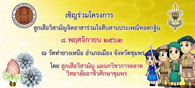 ขอเชิญลูกเสือวิสามัญ แผนกวิชาการตลาด วิทยาลัยอาชีวศึกษาชุมพร เข้าร่วมโครงการลูกเสือวิสามัญจิตอาสาร่วมใจประเพณีทอดกฐิน