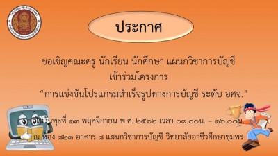 ขอเชิญคณะครู นักเรียน นักศึกษา แผนกวิชาการบัญชี เข้าร่วมโครงการ การแข่งขันโปรแกรมสำเร็จรูปทางการบัญชี ระดับ อศจ.