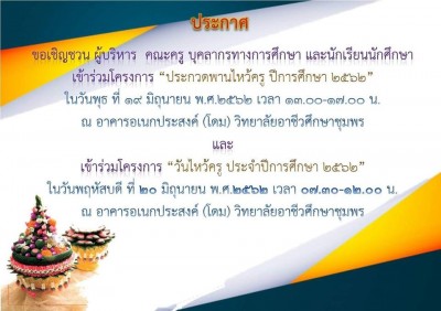 ขอเชิญ นักเรียนนักศึกษา วิทยาลัยอาชีวศึกษาชุมพรเข้าร่วมโครงการ ประกวดพานไหว้ครู ปีการศึกษา 2562