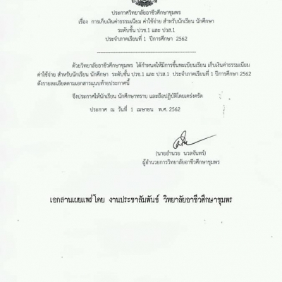 ประกาศค่าใช้จ่ายในการขึ้นทะเบียนเป็นนักเรียน ระดับชั้นปวช.1 และนักศึกษาระดับชั้นปวส.1 ประจำภาคเรียนที่ 1 ปีการศึกษา 2562 วิทยาลัยอาชีวศึกษาชุมพร สำหรับรอบทั่วไป