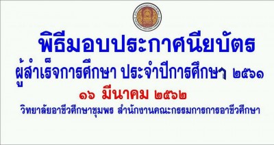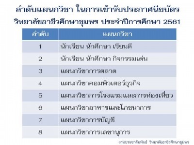 ลำดับแผนกวิชา ในการเข้ารับประกาศนียบัตร ผู้สำเร็จการศึกษา วิทยาลัยอาชีวศึกษาชุมพร ปีการศึกษา 2561
