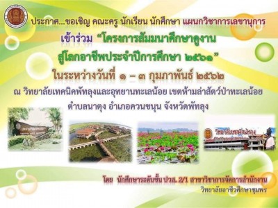 ขอเชิญคณะครูและนักเรียน นักศึกษา แผนกวิชาการเลขานุการ ร่วมโครงการ สัมมนาศึกษาดูงาน สู่โลกอาชีพ ประจำปีการศึกษา 2561