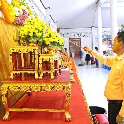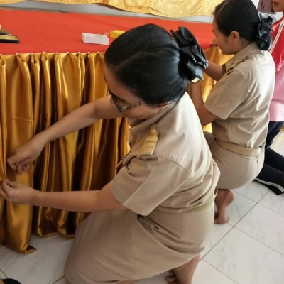 ที่วัดประเดิม ครู เจ้าหน้าที่และนักเรียน นักศึกษา จิตอาสาร่วมกันทำความดี ช่วยกันผูกผ้าบริเวณทำพิธีทอดกฐิน