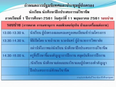 กำหนดการปฐมนิเทศและการประชุมผู้ปกครองของนักเรียน นักศึกษา ฝึกประสบการณ์วิชาชีพ ในสถานประกอบการ ภาคเรียนที่ 1