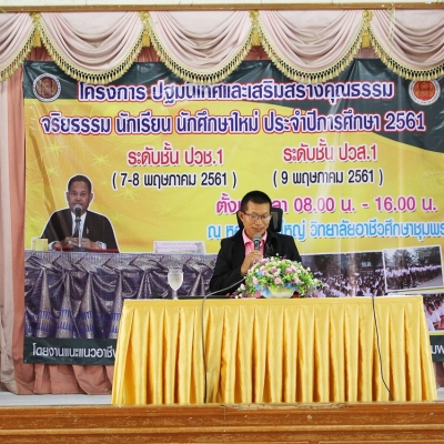 นายอำนวย นวลจันทร์ ผู้อำนวยการวิทยาลัยอาชีวศึกษาชุมพร เป็นประธานในพิธีเปิดโครงการปฐมนิเทศและเสริมสร้างคุณธรรม จริยธรรม นักเรียนระดับชั้นปวช.1 ประจำปีการศึกษา 2561