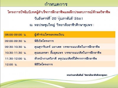 กำหนดการ โครงการปัจฉิมนิเทศผู้สำเร็จการฝึกอาชีพและฝึกประสบการณ์ทักษะวิชาชีพ