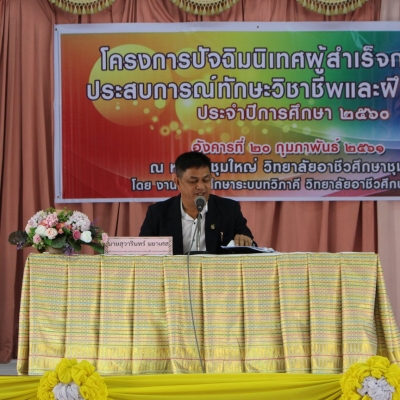 วันนี้ (20 ก.พ.2561) นายอารักษ์ พลยมมา ครูผู้ทรงคุณค่าของวิทยาลัยอาชีวศึกษาชุมพร เป็นประธานพิธีเปิดโครงการปัจฉิมนิเทศผู้สำเร็จการฝึกประสบการณ์ทักษะวิชาชีพและฝึกอาชีพ