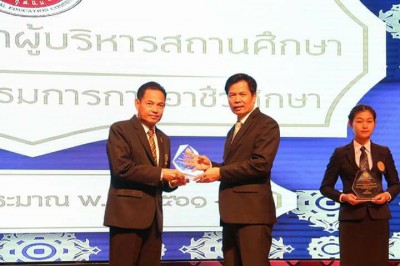 ดร.สุเทพ ชิตยวงษ์ เลขาธิการคณะกรรมการการอาชีวศึกษา เป็นประธานมอบโล่และเกียรติบัตร แก่นายอำนวย นวลจันทร์ ผู้อำนวยการวิทยาลัยอาชีวศึกษาชุมพร