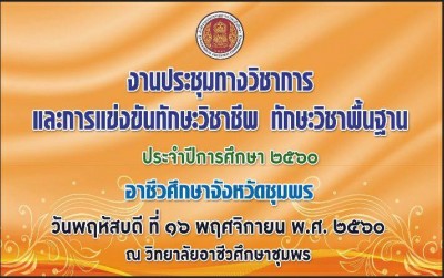 อาชีวศึกษาจังหวัดชุมพร ดำเนินการจัดงานประชุมทางวิชาการ การแข่งขันทักษะวิชาชีพ และทักษะวิชาชีพพื้นฐาน ประจำปีการศึกษา 2560 วันพฤหัสบดีที่ 16 พฤศจิกายน 2560 ณ วิทยาลัยอาชีวศึกษาชุมพร