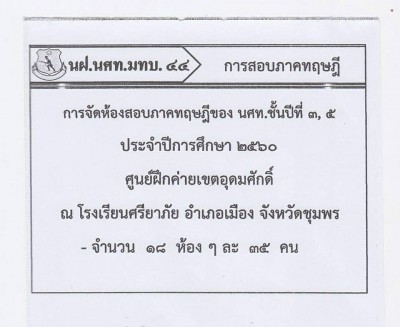 กำหนดการสอบภาคทฤษฎีนักศึกษาวิชาทหารชั้นปีที่ 3 ชาย,หญิง ในวันอาทิตย์ที่ 26 พฤศจิกายน พ.ศ. 2560 เวลา 08.00 น. ณ ศูนย์สอบโรงเรียนศรียาภัย อำเภอเมืองชุมพร จังหวัดชุมพร